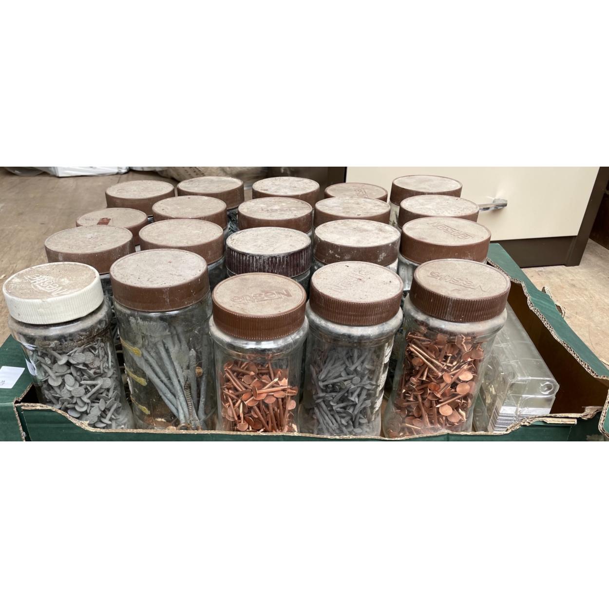 A large collection of 20 old coffee jars FULL of nails etc and some COPPER!