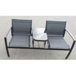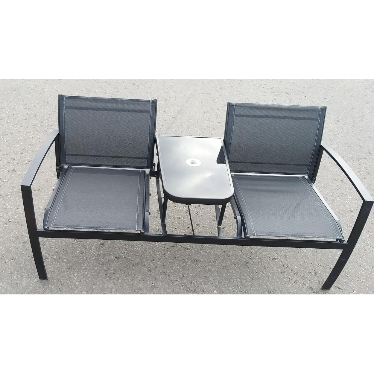 A good condition black metal 2 seater garden bench love seat 145cm wide