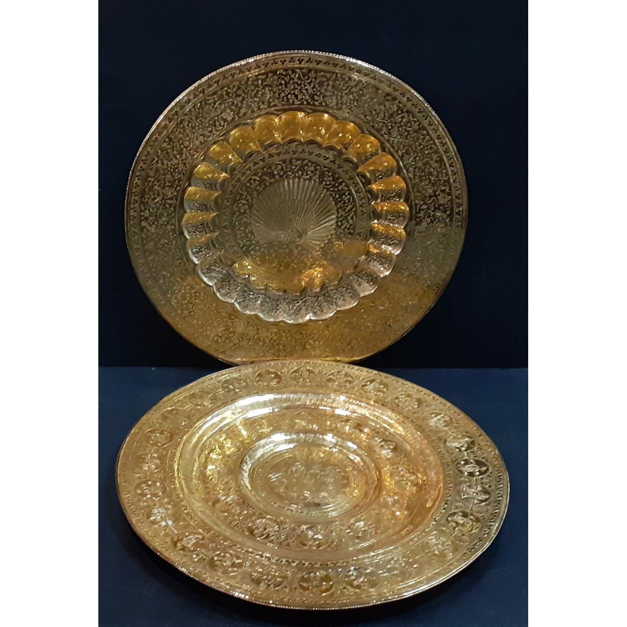Two very large (75cm) beaten brass oriental patterned wall chargers. A very impressive pair