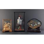 Three oriental diorama ornaments in cases including Geisha. three attractive pieces.
