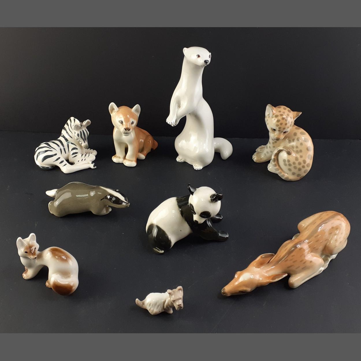 A group of eight LOMONOSOV Russian USSR animals. To include Zebra, Fox, Doog, Fawn, Badger, Stoat,Tiger & Leopard cubs and Panda All in good undamaged condition.