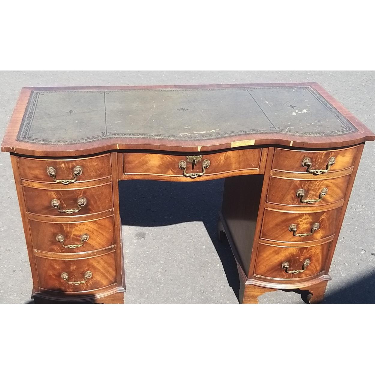 A reproduction double Pedestal desk with drawers. Chip noted to front and wear to top pads but a lovely useable imposing piece. Size 75cm tall, 115cm wide and 54cm deep.