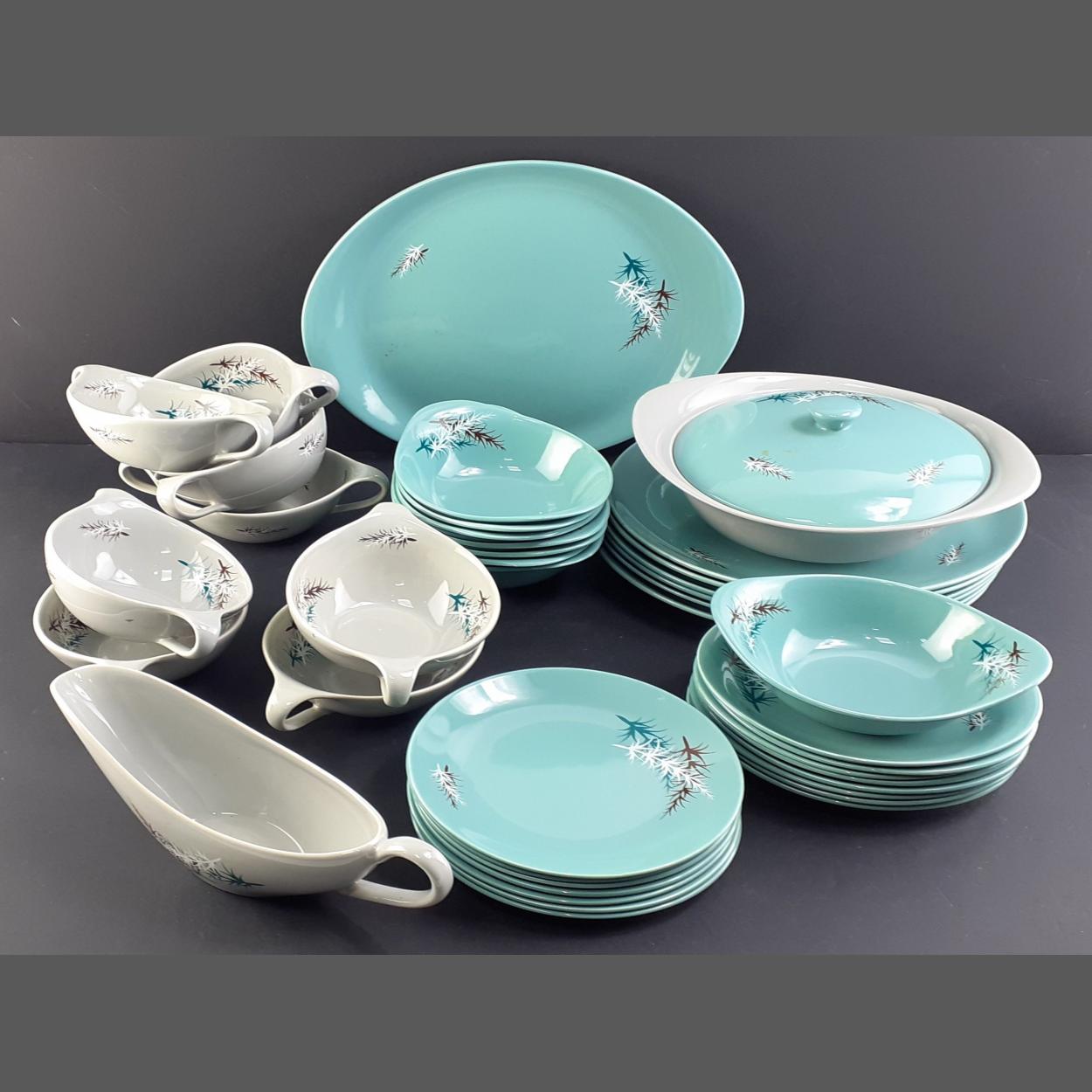OLD FOLEY Oregon Pine part service. Includes eight twin handle soup bowls with saucers. eight bowls, gravy boat, six dinner plates and others.