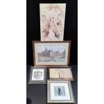 A collection of artwork to include a Vettriano print, horse's head, and pencil sketch of man panning for gold