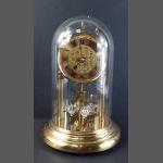A gilt pendulum mantel piece clock made in Germany with Roman numerals and glass case. Stands 25cm tall approx. In running order.