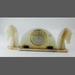 An onyx mechanical mantel clock in good working order W31cm x H18cm approx. Plus a pair of onyx seahorse heads, each 18cm (small chip from ears) approx.