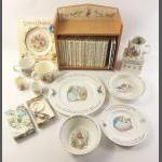 The BEATRIX POTTER lot to include ceramic bowl, plates, cups, ROYAL DOULTON plate, baby's rattle, egg cups, and a collection of the books in a wooden Peter Rabbit book shelf (28 x 12 x 15cm approx)
