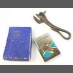 An antique bull head Bully Beef steel tin opener in good condition. Also a boxed lighter with Connell Bridge Dublin engraving.