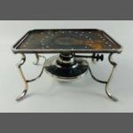 A silver plated butler tray with oil burner to keep food warm. EP plate markson burner. Measures 20cm, x 15cm x 10cm. An interesting piece.