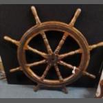 A large original SOLID OAK ship's wheel 110cm approx across in good condition. All spokes and centre boss in good order.