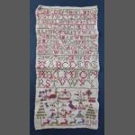 An antique sampler on linen signed by CW measuring 39 x 20cm approx. In good condition.