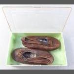 A tiny pair of a child's vintage brown leather shoes, only 12cm long approx