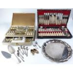 Two canteens of cutlery plus a silver plated tray with some EP flatware