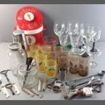 A drinks lot to include a plastic BEEFEATER GIN ice bucket, 3 Babycham saucers, and a large tumbler with "ON THE ROCKS!", cocktail shaker, shot measure plus plentiful tumblers, crystal glasses, wine goblets. A useful purchase for the coming season.