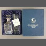 SELKIRK GLASS A lovely boxed engraved small decanter 15cm approx and two small shot glasses. All pieces with Rugby Player engraved but no dedication or personalisation. Nice pieces in good condition.