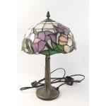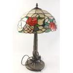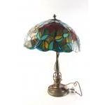 A large Tiffany style lamp with shade 44cm approx, stands 63cm approx, some damage to shade. Still a very attractive piece