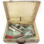 A small travel case containing eight vintage torches. Metal bodies, corrosion noted to one.