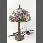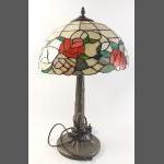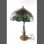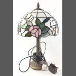 A large Tiffany style lamp with shade 44cm approx, stands 63cm approx, some damage to shade. Still a very attractive piece