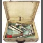 A small travel case containing eight vintage torches. Metal bodies, corrosion noted to one.