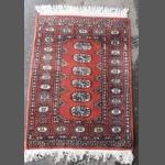 A small fringed red rug with 6 centre medallions 95x66cm approx