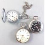 Three interesting fob watches, one an antique steel cased fob watch with damage to the enamel, a WESTCLOX Scotty in good working condition, and a modern non-running watch.