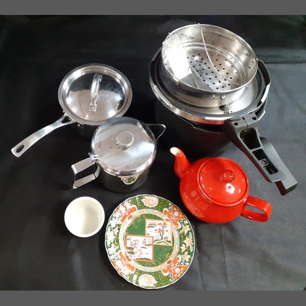 A Prestige pressure cooker and associated kitchenware.