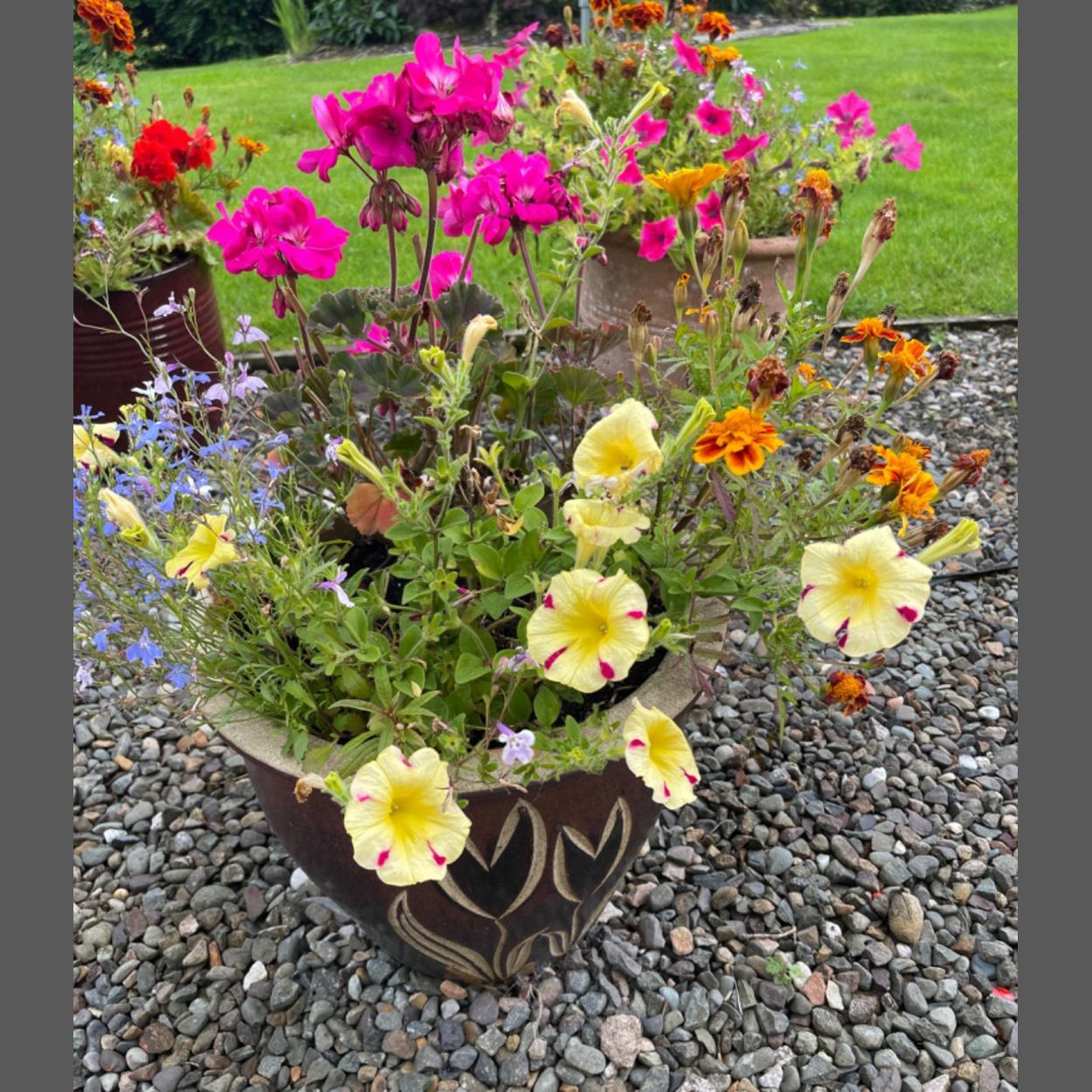 A DELIGHTFUL planted ceramic garden container to include primrose-yellow petunias and pink geraniums summer planting - 35cm height approx