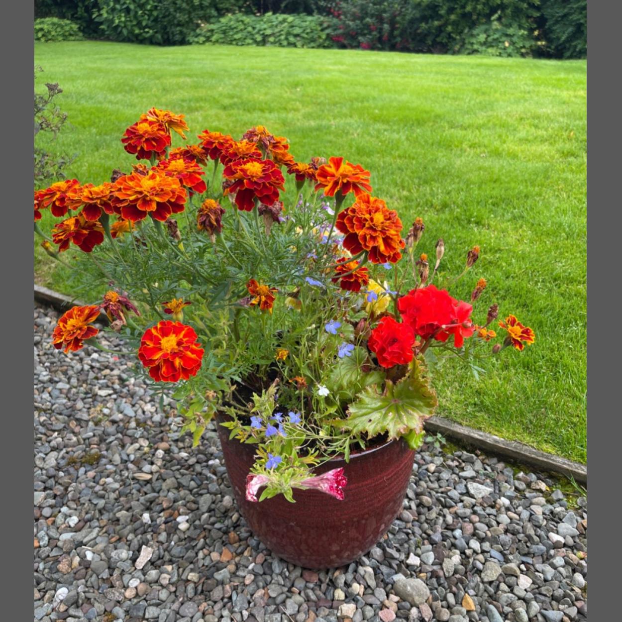 A DELIGHTFUL planted red drip glazed garden container to include a big bunch of French Marigolds and mixed Lobelia summer planting - 35cm height approx