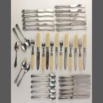 A small box with VINTAGE 6 place setting fish knives and forks, with 10 nice quality tea spoons and 12 small butter knives by W&H (Walker and Hall) plus 2 odd ones, one of which is silver handled
