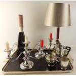A mixed lot to include a useful WOODMET tray with two EP candlesticks, a small VICEROY teapot with matching cream and sugar, an AEROLUX flower lamp and a handy small side table lamp.