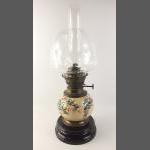A vintage ceramic base oil lamp with lovely floral bulbous base. Made in Germany stamped on the wick winder. Superb quality shade and chimney. Stands 53cm approx to top of chimney. A striking and unusual lamp.