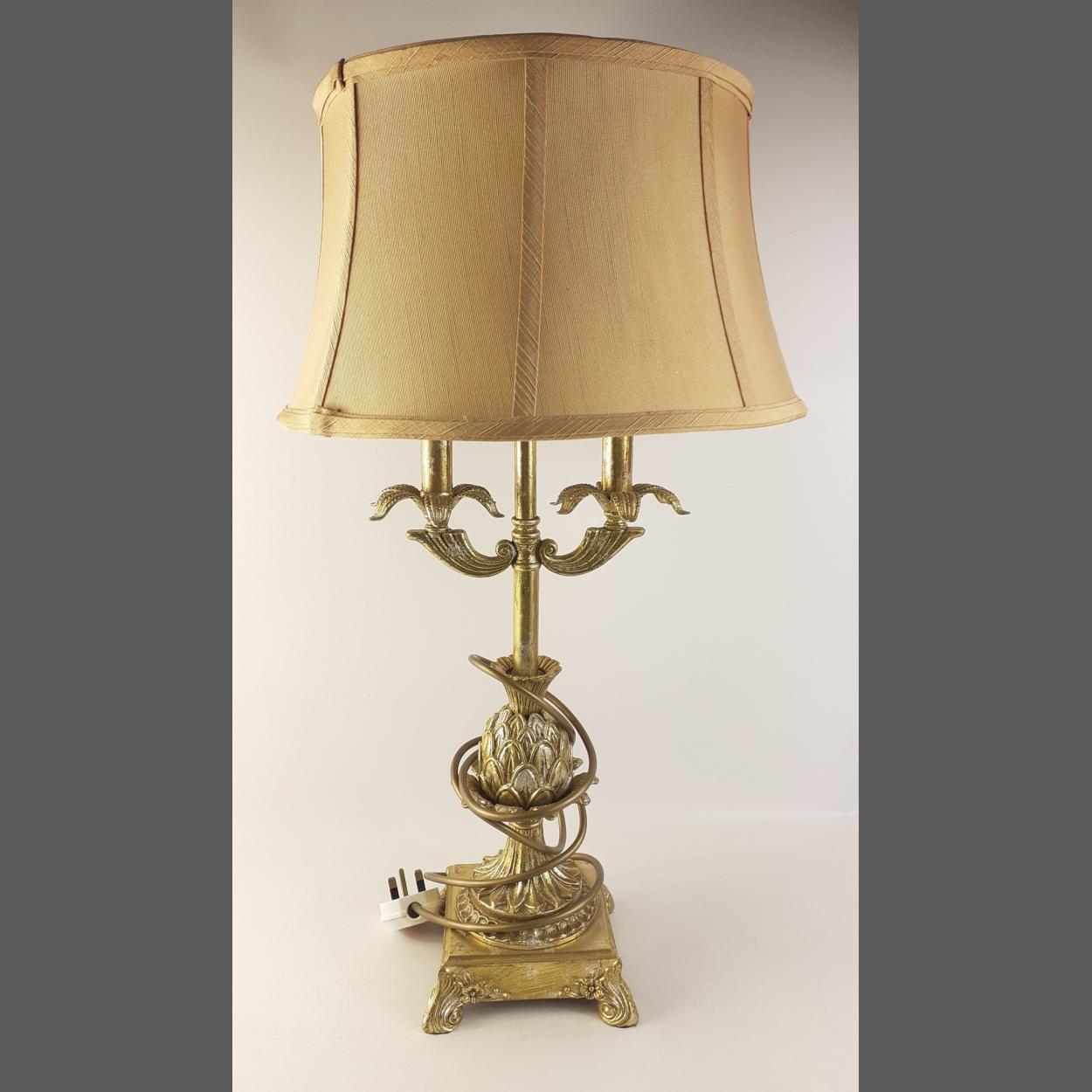 One of a pair of attractive gilt table lamps with cream shades. Base stems have pretty applied pineapples. Stands 64cm to the top of the shade.