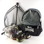 A Lonsdale sports bag containing some good quality reels to include LEEDS PROFIL 5/6, ALEKA A4 7/8, TF GEAR 7/8, REDINGTON PATH 4/5/6 and one other. Lot includes spare spools and a landing net.