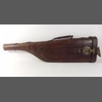 Antique Leg of Mutton shotgun case. A hard shell with a brown leather outer, carry handle, leather strap and fitted interior. Named inside case cap with a paper label to James McNaughton, Hanover Street, Edinburgh. Owner's stamp A Ainslie to front. The leather is in good condition but would benefit from a wax, brass lock works well but no key, all straps, strap hooks, handle are also in good condition. Carries an interesting On Her Majesty's Service paper label on rear. All in all a lovely example of the type. Measures 80cm approx.