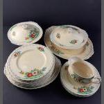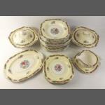A vintage GRINDLEY WARE dinner service comprising 6 plates 20cm (1 with small chip), 4 x 23cm, 6 x 25cm dia, 2 lidded vegetable dishes, 3 serving platters of 30cm, 31cm and 37cm approx and 1 sauceboat