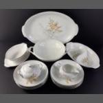 A part SANGO of Japan porcelain dinner service with silver trim to include a fixed gravy dish, a twin handled bowl, 8 shallow bowls 20cm diameter, a sugar and cream, a knik-knaks plate, a large sandwich plate 41cm x 28cm - high quality items!