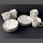 MELBA Bone China tea set. Comprises six cups, six saucers, six side plates and a cream jug. One cup with a crack.