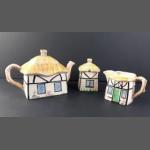 A CROWN WINSOR Tudor Cottage tea service comprising a teapot, milk jug and lidded sugar bowl
