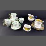PARAGON Springtime (made for LAWLEYS of REGENT STREET), one octagonal plate (14cm dia), 1 cup and saucer and sugar bowl each with gilt rims and a milk jug with blue handle and rim, plus 6 demitasse cups and saucers pattern F2156 (1 cup with a hairline crack)