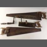 Three lovely antique saws to include an ALEX MATHIESON & SONS GLASGOW 65cm, an unmarked 61cm saw and a TYZACK & SONS & TURNER. Also includes an antique Auger Bit and brace.