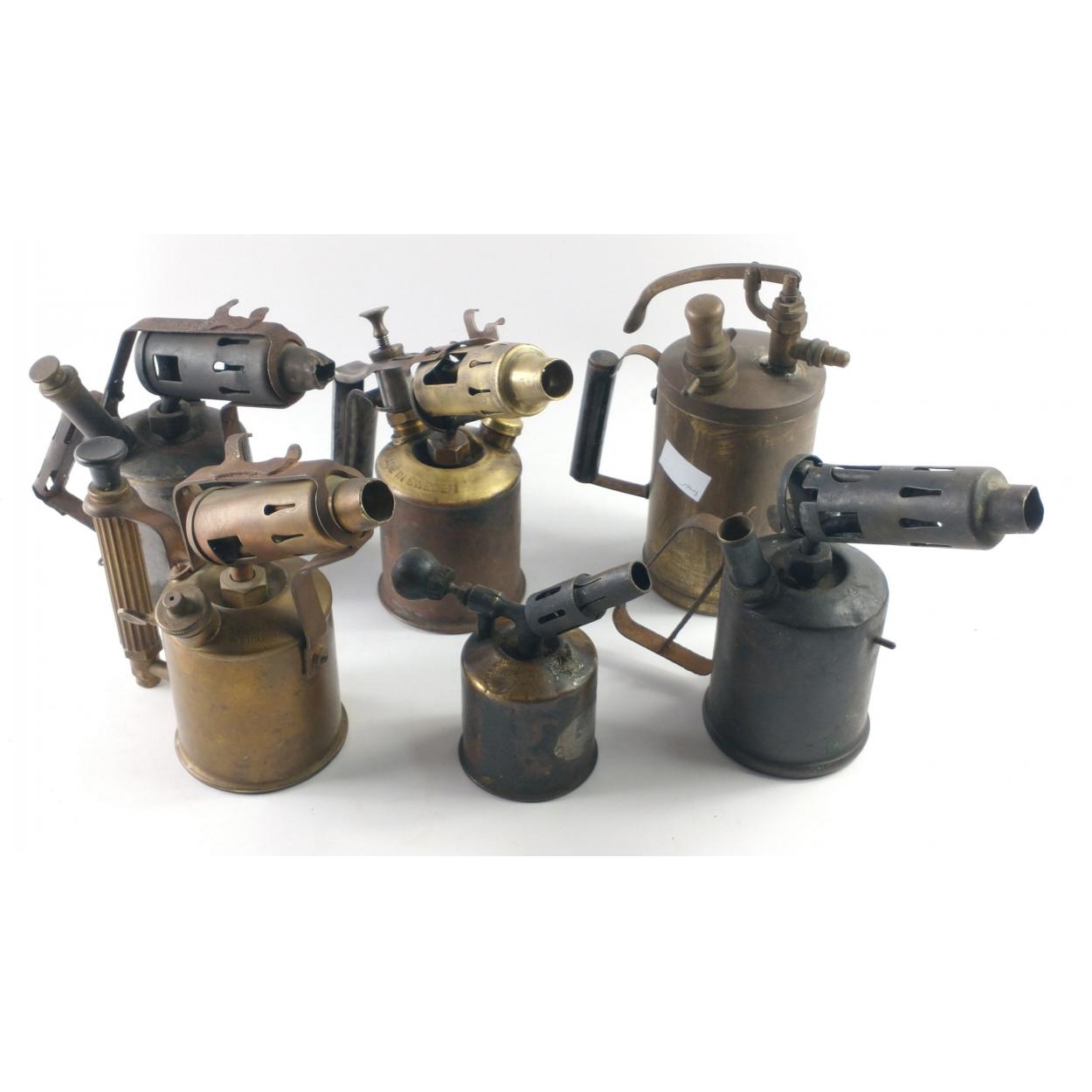 A super collection of five antique hand-held blow torches and one sprayer. Includes a nice couple of SIEVERTS and others. Great little display lot