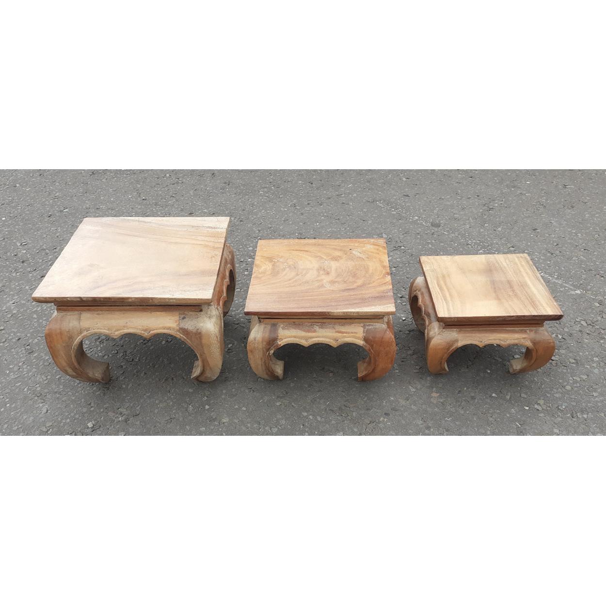 Three small wooden carved tables. The largest 35cm x 35cm and 27cm tall approx