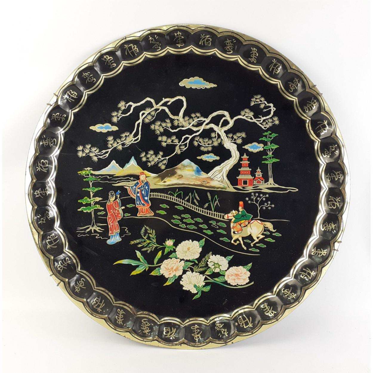 A highly decorated Oriental CHINESE metal tray by BARRET WARE with wall hangers. 47cm diameter approx.