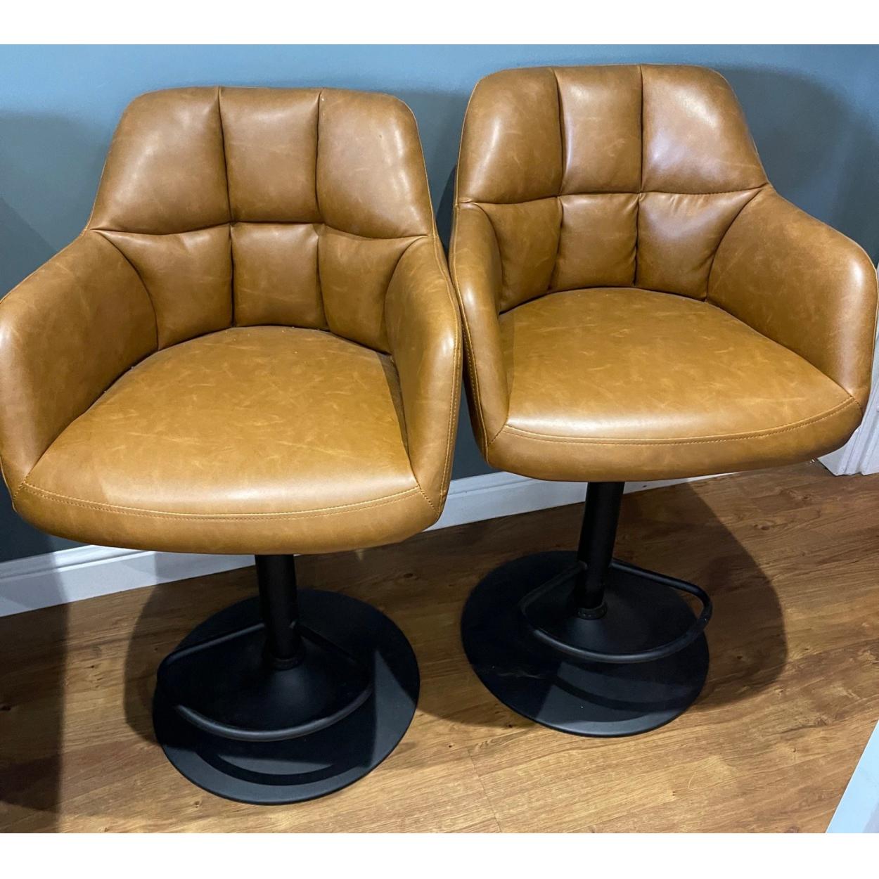 Two tan faux leather swivvel bar chairs - in nice condition