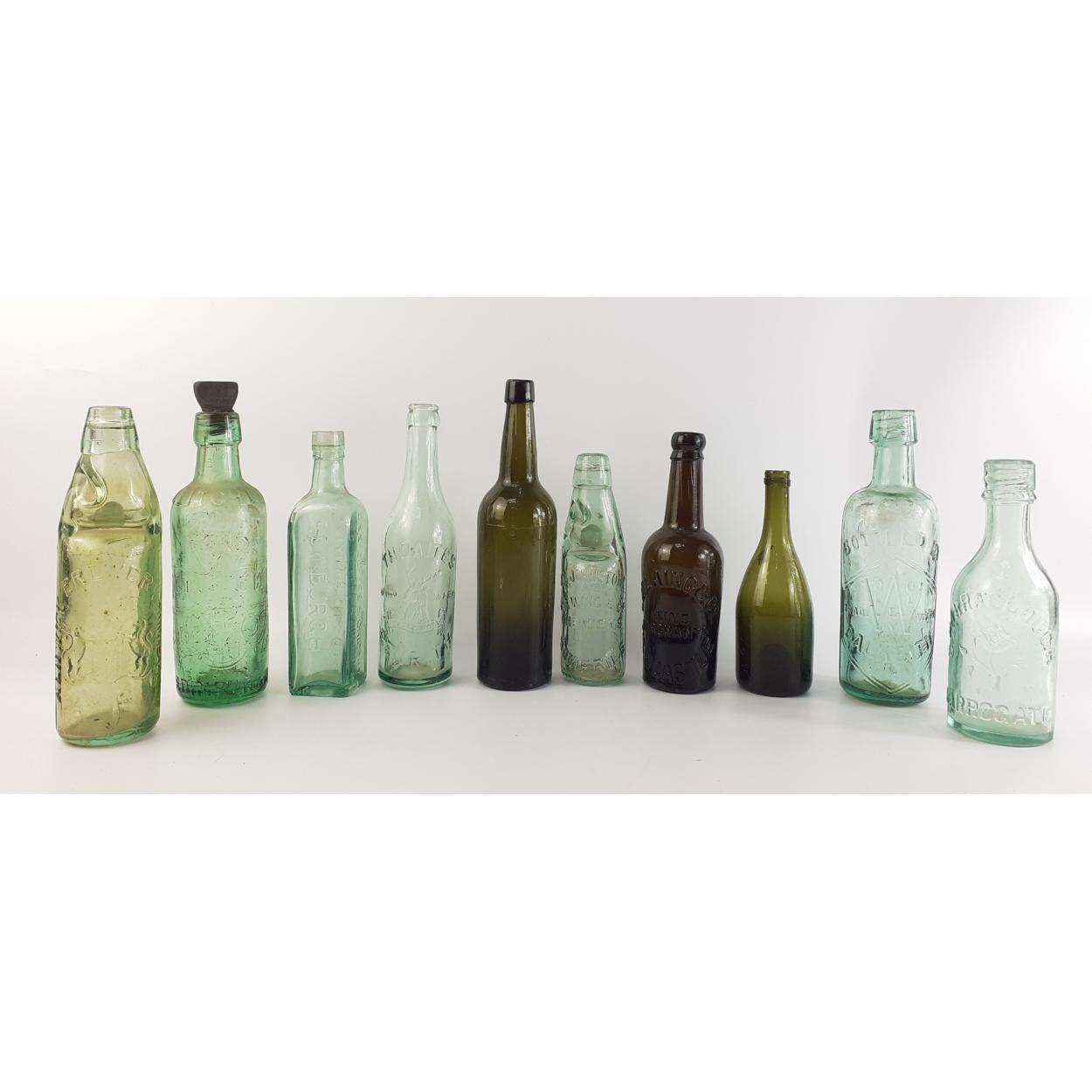 A collection of vintage bottles of interest to include an ALNWICK BREWERY COMPANY Codd, A DUMFRIES Codd bottle, a Leitch of EDINBURGH screw top with stopper, a DALKEITH screw top minus stopper, an EDINBURGH ESS coffee bottle, a Thwaites of PENRITH bottle a Barraclough of HARROGATE bottle and others. Ten great bottles in total.