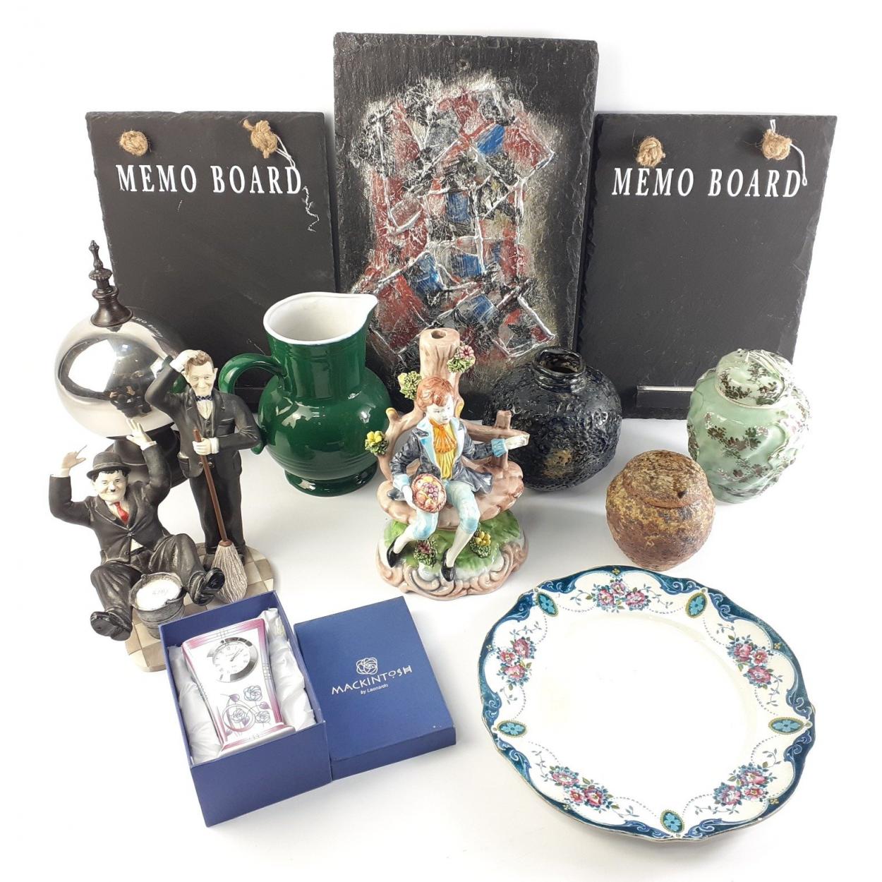 A mixed decorative lot of interesting pieces to include Laurel & Hardy A/F, Mackintosh style clock, pottery vases, green jug, decorative boy on a bench and others including three slate memo boards.