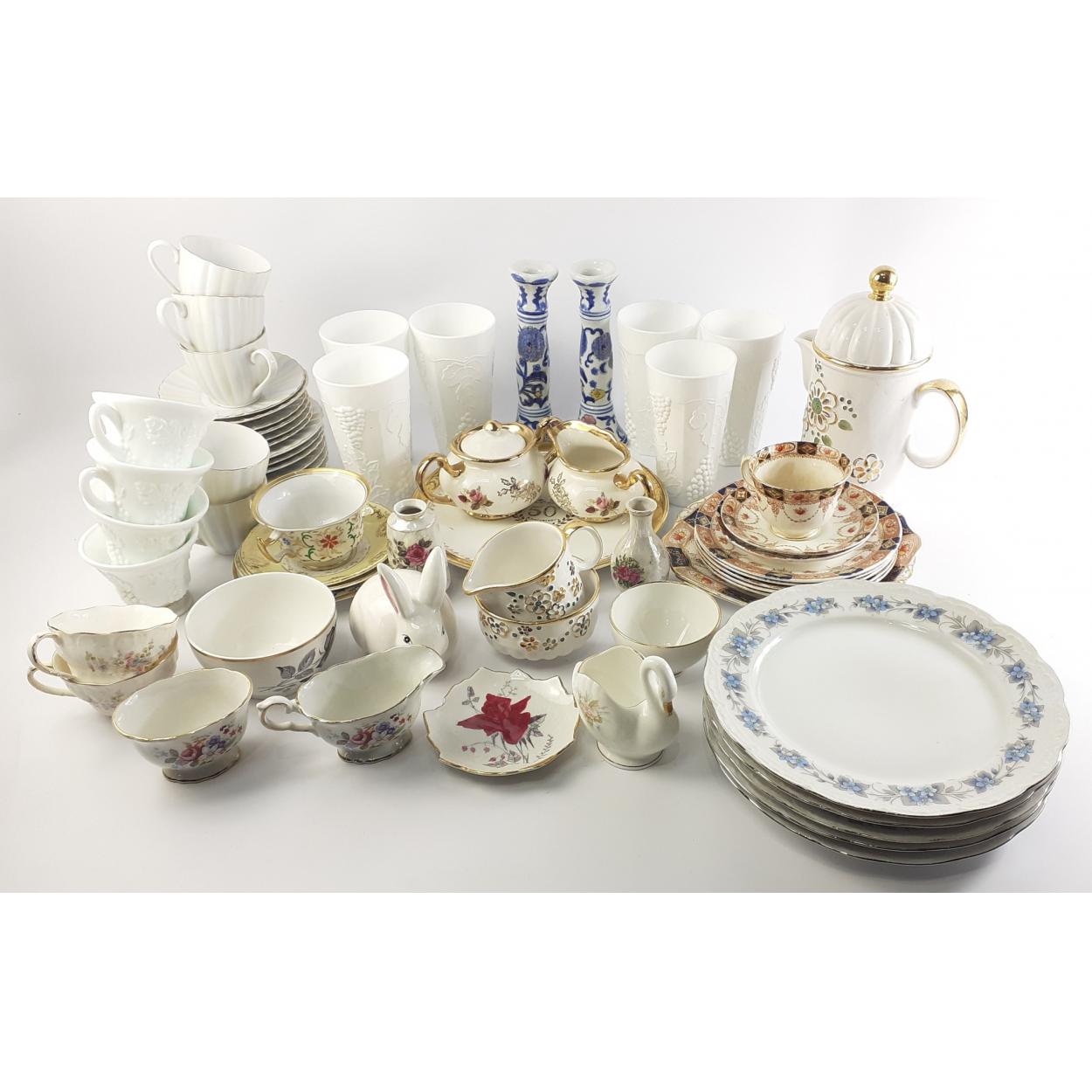A mixed ceramics lot containing shorter teapot, plates, saucers, 6 milk glass tumblers and cups with grape design all in good condition, part tea service to include some MITTERTEICH large useable floral plates, etc