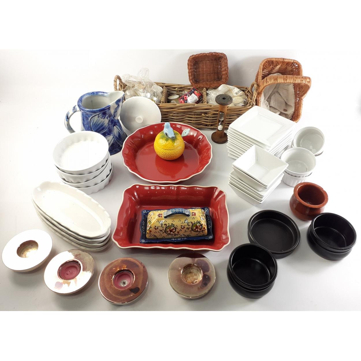 A good ceramic kitchen ware lot to include blue and white jug, white trays, and a quantity of tealights