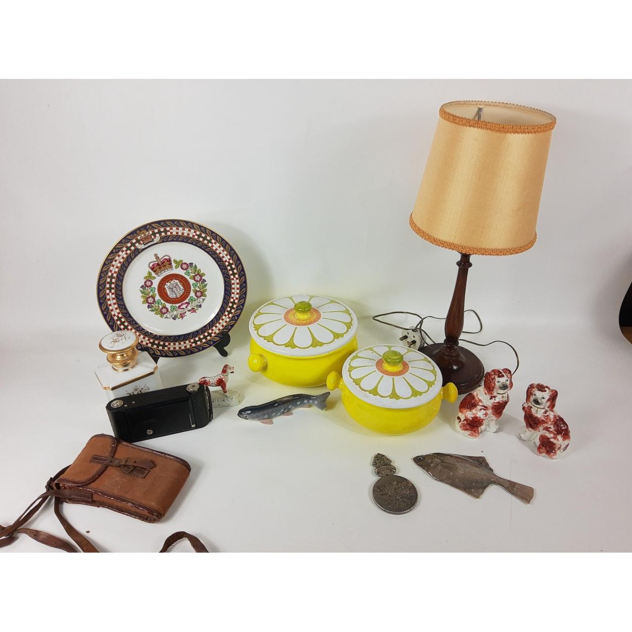 A mixed box to include a pair of small red and white WALLY DUGS (11cm tall) with a small standing hound (8cm high), a B&G trout (17cm long, small piece from end of tail missing), a flounder (18cm long), a box camera in case, a limited edition (441/500) SPODE plate (27cm dia), from 1975 commemorating the battle honours of the King's Own Scottish Borderers, 2 BELLINI PIROLYTE lidded casserole dishes 20cm and 16cm dia etc