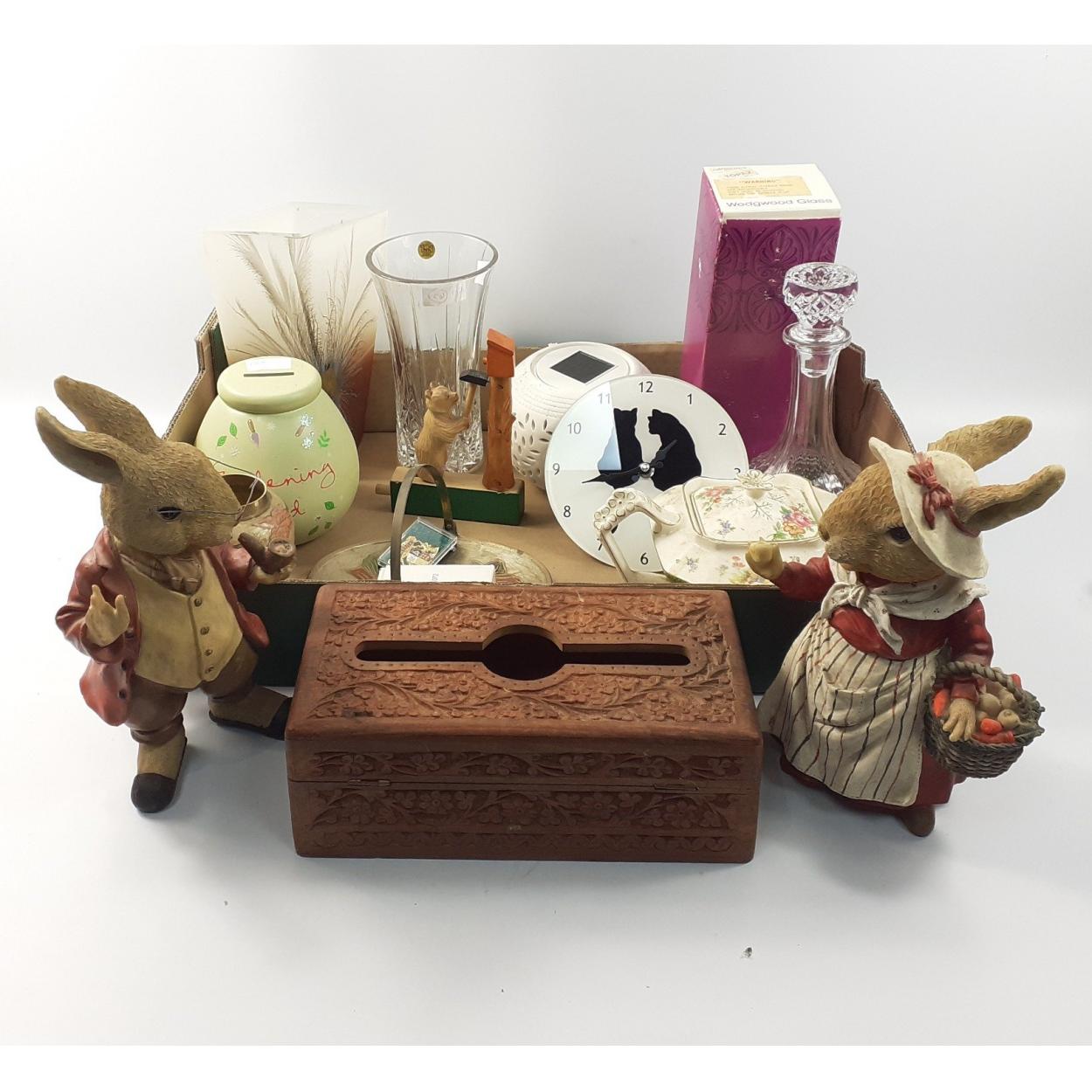 A mixed box to include ceramics like a 'gardening Funds' savings bank, a ROYAL CRYSTAL ROCK Branded crystal vase 23cm tall, a nice carved wooden Oriental style lidded box designed for tissues 28cm length x 15cm depth x 10cm height plus two ornamental Beatrix Potter inspired rabbits 30cm tall approx and so much more!!